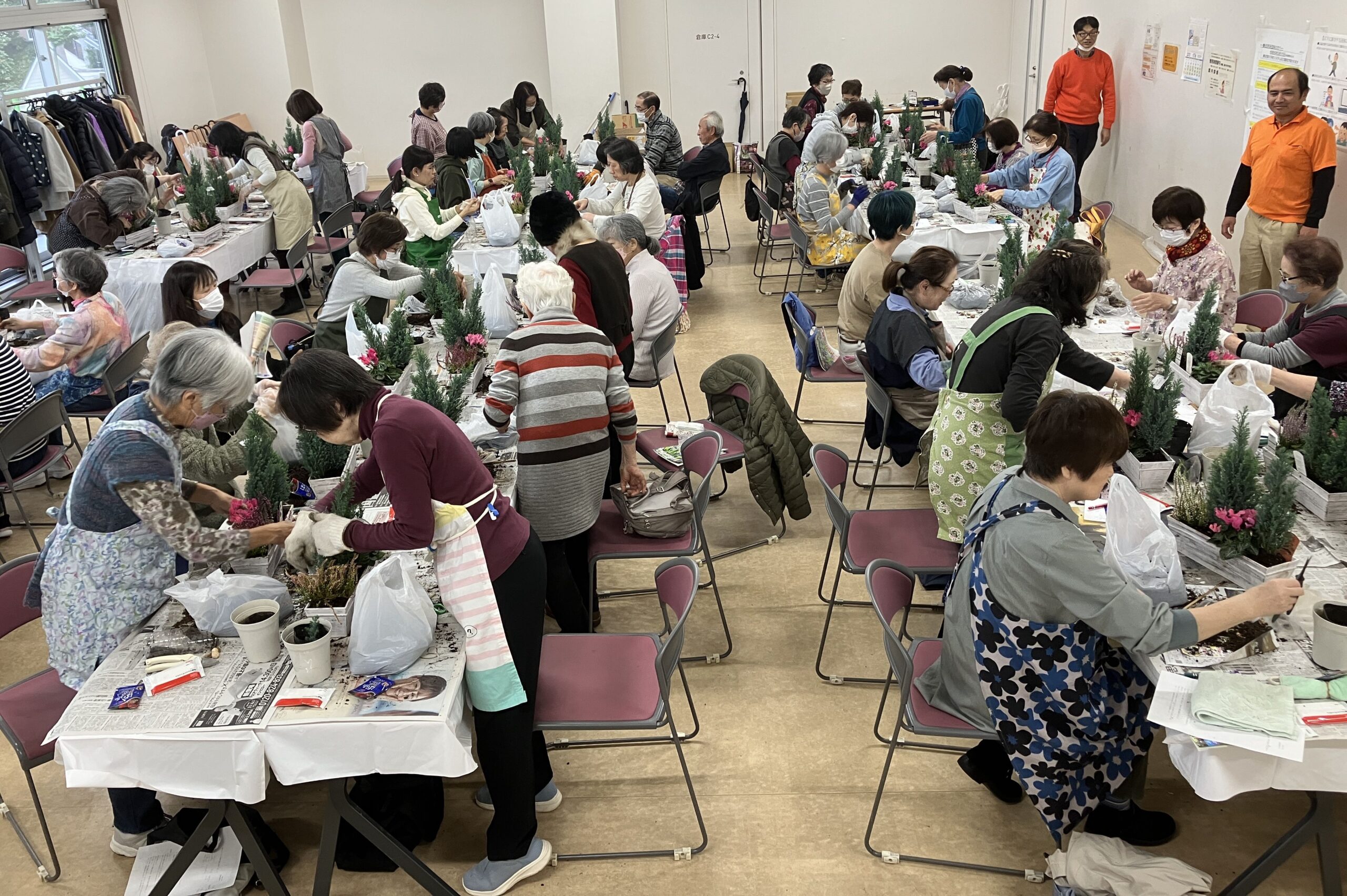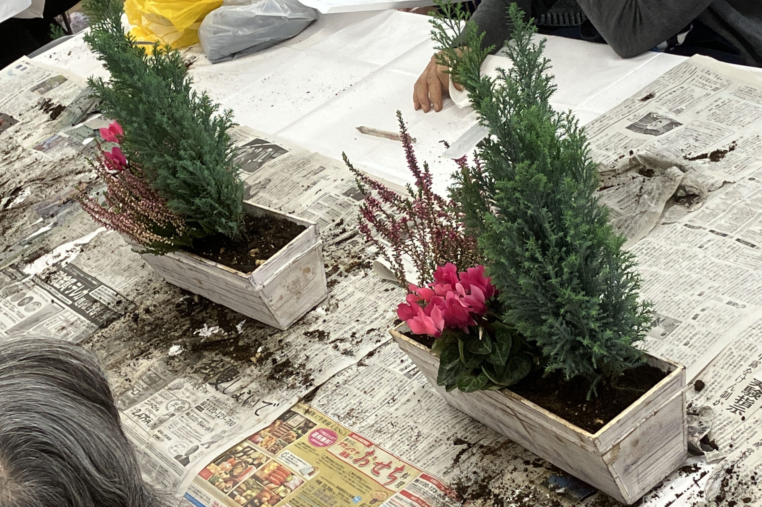 “北欧のクリスマス風寄せ植え”と題して、ミニコンテナにコニファーや花苗、球根などを植えていきました。